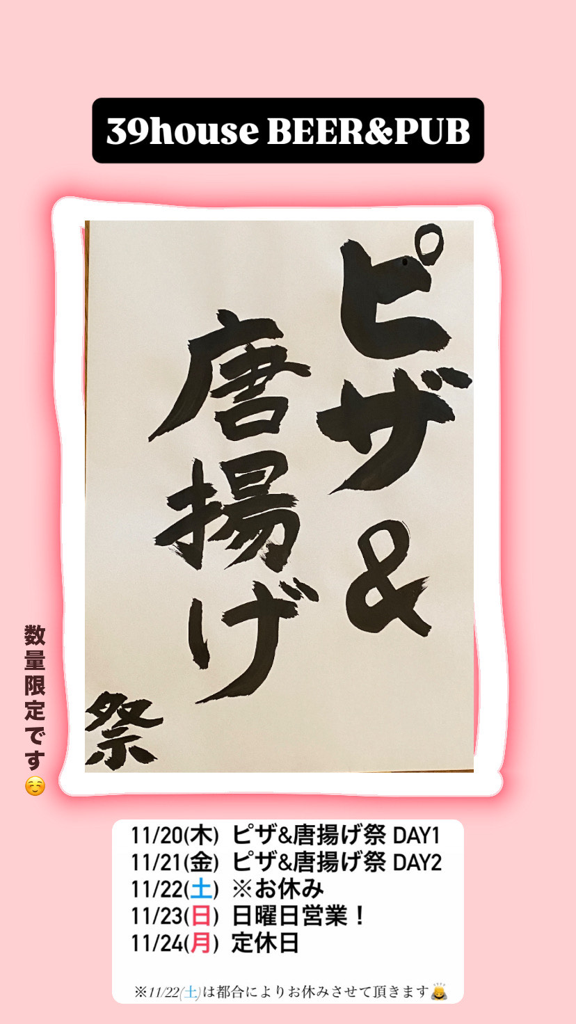 みんな大好き39特製唐揚げにピザ付きお祭りを2日間開催させて頂きます!