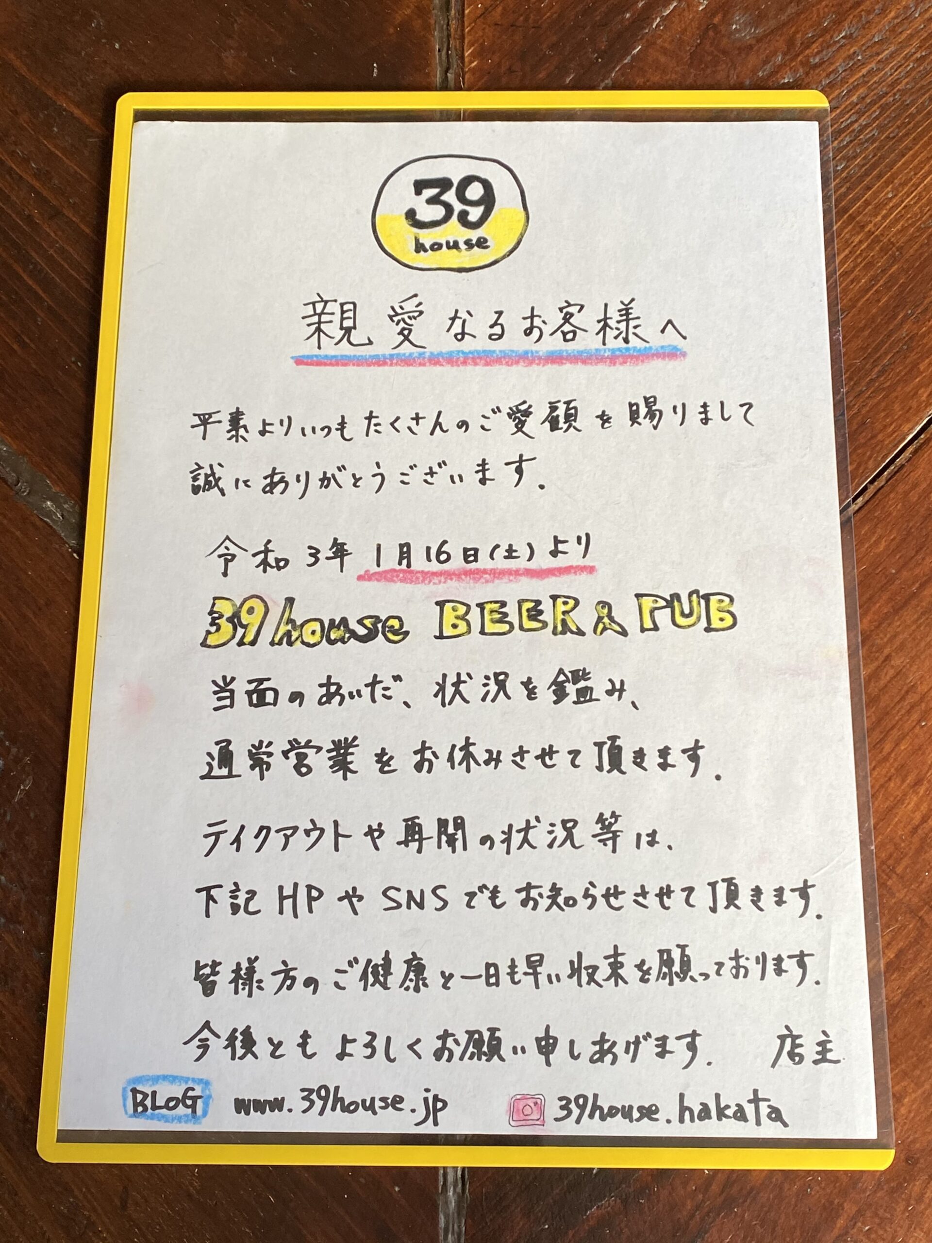 この度の国の2度目の緊急事態宣言による飲食店への要請により、39house BEER&PUBでは下記の対応をさせて頂くことに致しましたのでご連絡申し上げます。